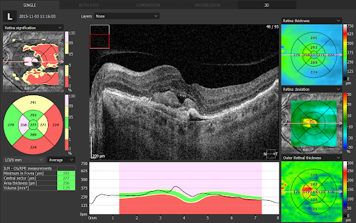 Το OCT είναι πλέον απαραίτητο για τη διάγνωση αλλά και την παρακολούθηση της θεραπευτικής πορείας πλήθους παθήσεων του αμφιβληστροειδούς, όπως η ηλικιακή εκφύλιση της ωχράς κηλίδας, το οίδημα της ωχράς κηλίδας σε έδαφος διαβητικής αμφιβληστροειδοπάθειας ή φλεβικών αποφράξεων, η κεντρική ορώδης χοριοαμφιβληστροειδοπάθεια, η οπή ωχράς κηλίδας, η επαμφιβληστροειδική μεμβράνη, οι υαλοειδο-ωχρικές έλξεις κ.α.